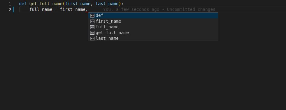 Vous écrivez le premier paramètre, first_name, puis un point (.) et appuyez sur Ctrl+Espace pour déclencher l'auto-complétion.